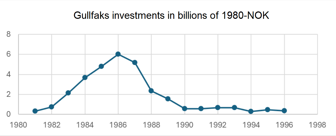 Between 1981 and 1996, it cost NOK 30.4 billion (in 1980 terms) to develop and operate Gullfaks. This is significantly lower than the NOK 36 billion projection (excluding operations). Actual investments peaked in 1986, then declined rapidly. From 1990 onwards, they remained below NOK 1 billion per year.