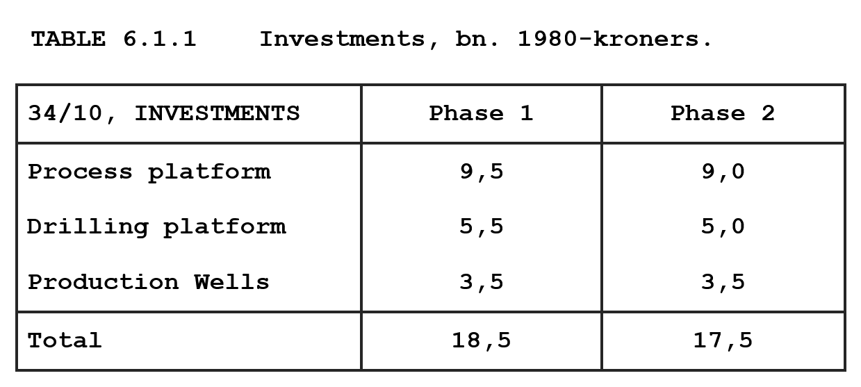 More than half of the total investment costs would be tied to the two concrete processing platforms. The steel drilling platforms were estimated at NOK 10.5 billion combined, while production wells would add another NOK 7 billion. Operating costs were calculated separately.[REMOVE]Fotnote: Statoil ASA. (1980). Drivverdighetsstudie, bind I: Sammendrag og konklusjoner. S. 35 (Arkivreferanse: AV/SAST-A-101656/0001/D/Dc/L0831/0003). Sentralarkivet/Fjernarkivet, Saks- og korrespondansearkiv, konsernarkivet