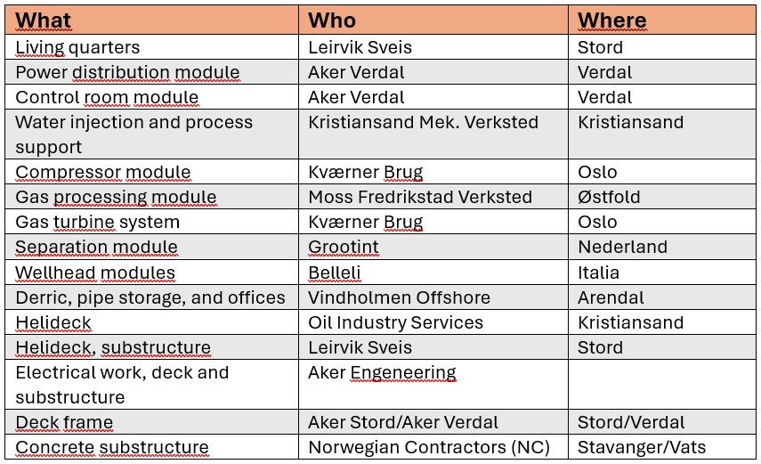 Other suppliers included Kværner Bruk, which delivered the gas turbine package and the compressor module; Kristiansand Mekaniske Verksted built the water‑injection and process support module; Vindholmen Offshore handled the