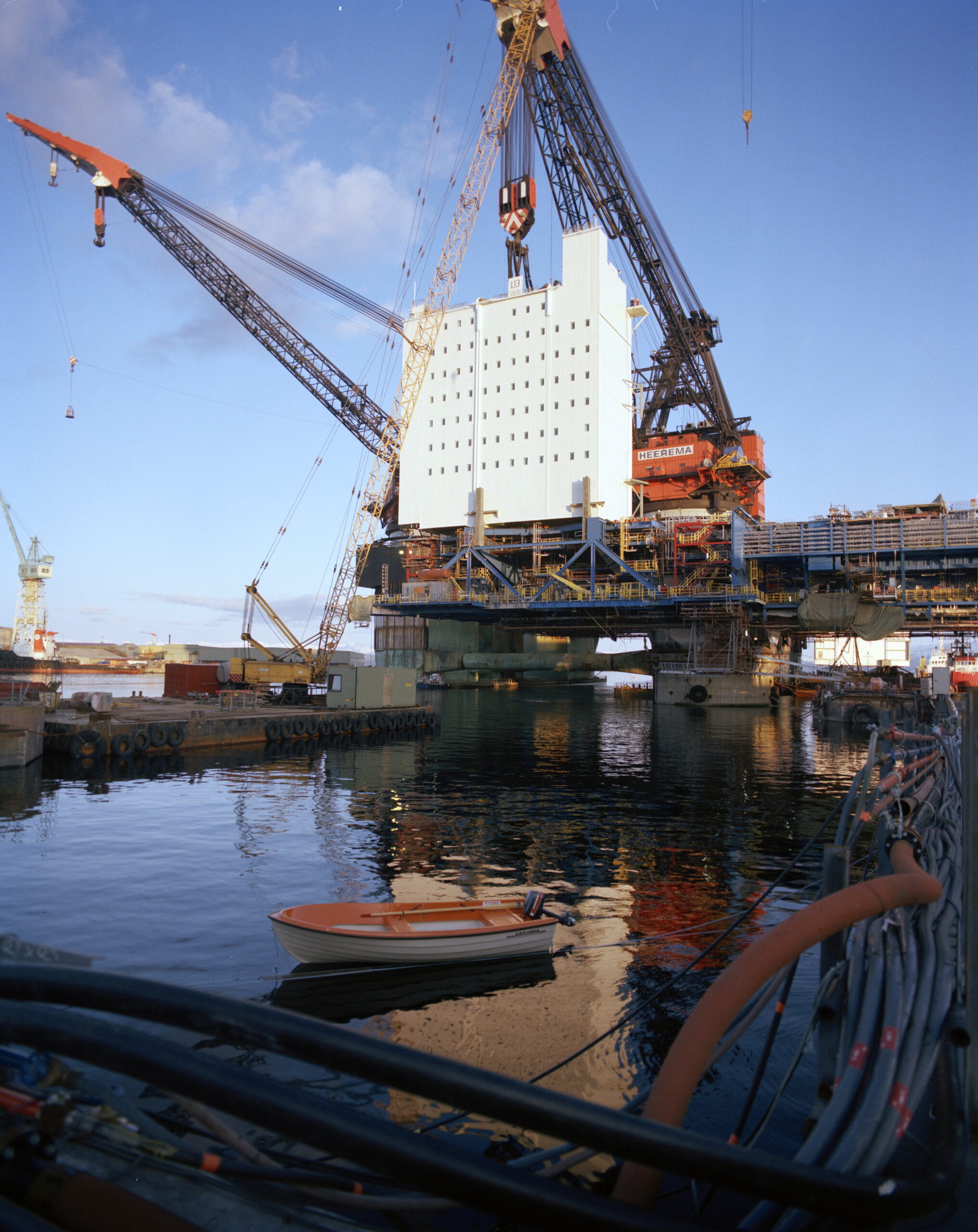 The largest module, D11, weighed 2,400 tonnes and was built at Bergens Mekaniske Verksted (BMV). To strengthen Norwegian industry, engineering work was transferred from NRC in Kristiansand to BMV. During construction, BMV went bankrupt, creating great uncertainty. After political pressure and efforts from the workforce, the yard was taken over and the module completed on time – including testing of the power station. Other modules were also tested before delivery, and the degree of completion before assembly had never been higher in a Norwegian offshore project.