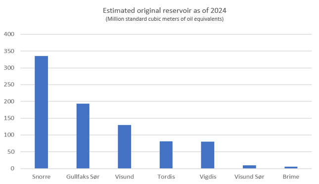 The bars show the Norwegian Offshore Directorate’s estimates of the original recoverable resources in the reservoirs of the various fields that have delivered oil or gas to Gullfaks, measured in million standard cubic metres of oil equivalent. The Snorre field is by far the largest, although much of its production is exported to Statfjord rather than Gullfaks. Brime, which includes Gimle and Sindre, is the smallest, with an estimated 5.4 million standard cubic metres of oil equivalent.