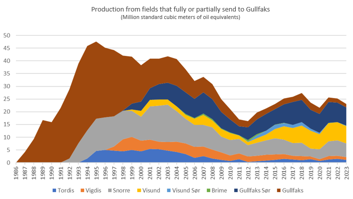As of 2023, these fields have produced 65 percent more than Gullfaks itself. By 2025, the majority of the oil and gas exported from Gullfaks will therefore originate from other fields. These fields—both those operated from Gullfaks and those operated independently but sending their production to Gullfaks for processing and storage—help extend the operational life of the Gullfaks platforms. The many surrounding fields allow the original Gullfaks installations to remain profitable, even with a very low level of production from the original field itself.