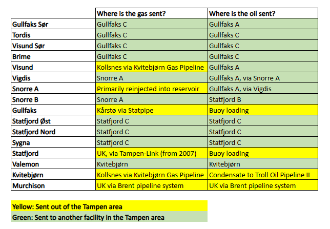 Fields in the Tampen area are closely integrated and benefit from shared infrastructure. Gullfaks plays a key role in this system. It consists of three integrated concrete platforms for processing, drilling, and accommodation, along with a loading buoy. This setup makes Gullfaks well suited to receive, process, store, and export petroleum from surrounding fields. Gullfaks is also connected to the Statpipe gas pipeline leading to the Kårstø processing plant in Rogaland.
