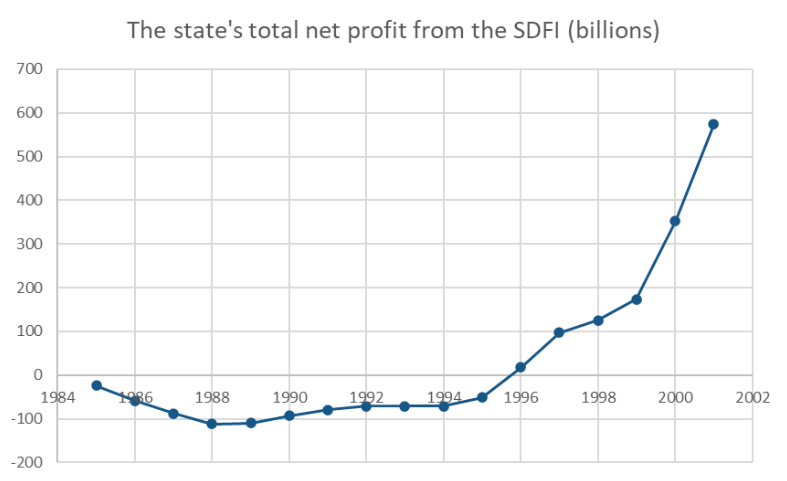 As a result, the SDFI operated at a loss for several years. The graph below shows the cumulative financial result of the SDFI portfolio from its inception in early 1985 through 2001. It wasn’t until 1996 — eleven years later — that the state’s cumulative revenues from the portfolio exceeded its total expenditures.