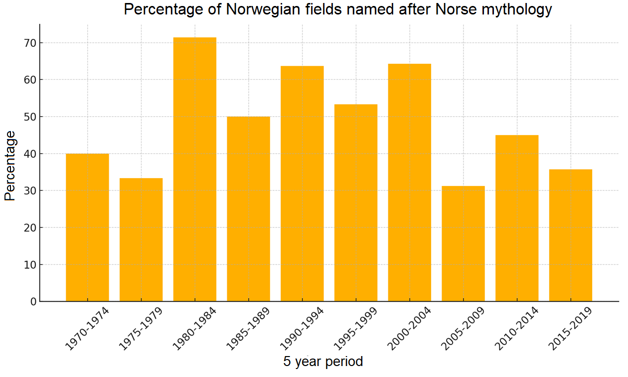Norse names have been a recurring trend in Norway’s oil history, with a marked increase in the early 1980s. In the five years leading up to the approval of the first plan for development and operation (PDO) for Gullfaks in 1981, over 70% of field names were derived from Norse mythology. The name Gullfaks reflects this era.