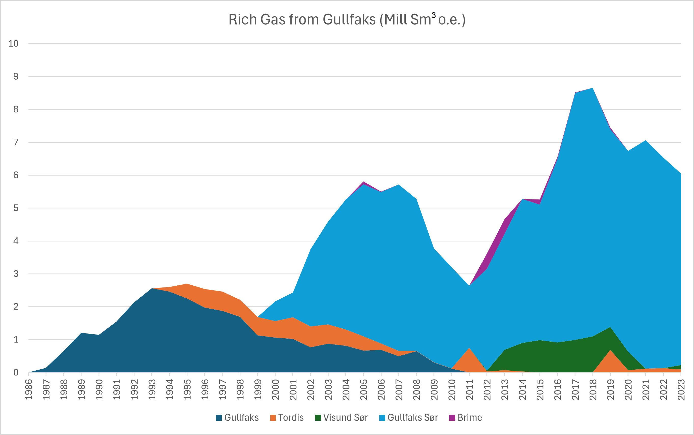 According to data from the Norwegian Offshore Directorate, Gullfaks ceased its own gas production in 2010. However, Gullfaks C continues to receive significant volumes of gas from surrounding fields. This gas is then exported via Statpipe. The contributing sources include subsea installations, nearby platforms, and wells drilled from the Gullfaks facilities that are considered part of other fields.[REMOVE]Fotnote: The classification of fields is based on the Norwegian Offshore Directorate’s website. These include Visund, Tordis, and the Brime unit (Sindre and Gimle). By far the most important contributor, however, is Gullfaks Sør, which in 2023 accounted for just over 96 percent of the gas exported from the Gullfaks platforms.
