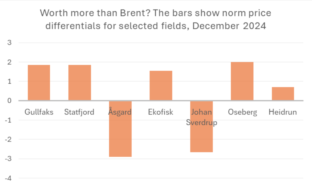 In December 2024, Gullfaks had a differential of $1.85, as shown in the figure below. That means the tax calculation for oil from the Gullfaks license used the Dated Brent price on the fifth day after loading — plus an additional $1.85 per barrel.[REMOVE]Fotnote: Norwegian Ministry of Energy. (2024, December 9). Petroleum Price Board and Reference Prices. https://www.regjeringen.no/no/tema/energi/olje-og-gass/petroleumsprisradet–og-fastsetting-av-n/id661459/