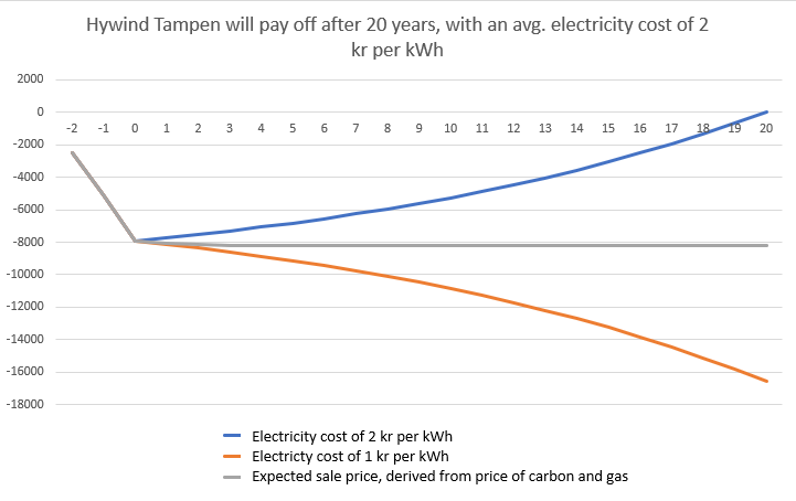 The figure below shows the profitability development of Hywind Tampen, based on different assumptions about electricity prices. Given the expected sales price, the revenues from the turbines will be roughly equal to the capital costs associated with building the facility, meaning the project will not pay for itself.[REMOVE]Fotnote: Vedlegg – Nedbetalingstid Hywind Tampen https://nomus2.sharepoint.com/:x:/r/sites/Gullfaks/Delte%20dokumenter/General/Kilder/Olegreier/Nedbetalingstid%20Hywind%20Tampen.xlsx?d=w33ea2c45fab14435b4633912efc1b76f&csf=1&web=1&e=hNJ3wi Note that the overview shows the payback period for the project itself, not the payback period from the company’s perspective.