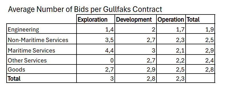 The market concentration was reflected in the low number of bidders per contract—typically only two or three. The table below shows the average number of bids received for selected contract types related to the Gullfaks project.