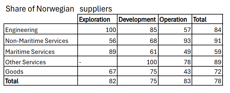 The number of bids per segment is especially interesting when viewed alongside the share of contracts awarded to Norwegian companies (including foreign firms with Norwegian subsidiaries). Across all three project phases—exploration, development, and operations—the combined Norwegian share was 78 percent, though this varied by service category.