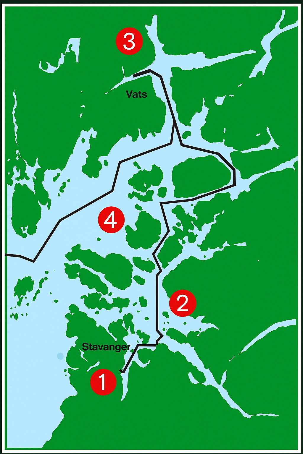 The first leg of the voyage (see point 1 on the map) ran northeast in Gandsfjorden, then east along the north side of the island of Usken, and then north again (2) between Talgje, Fogn and Finnøy. The shortest way onward would have been to continue north between Sjernarøyene and Ombo, but the water there is shallow. So the journey continued around much of Ombo, first along the south side, then