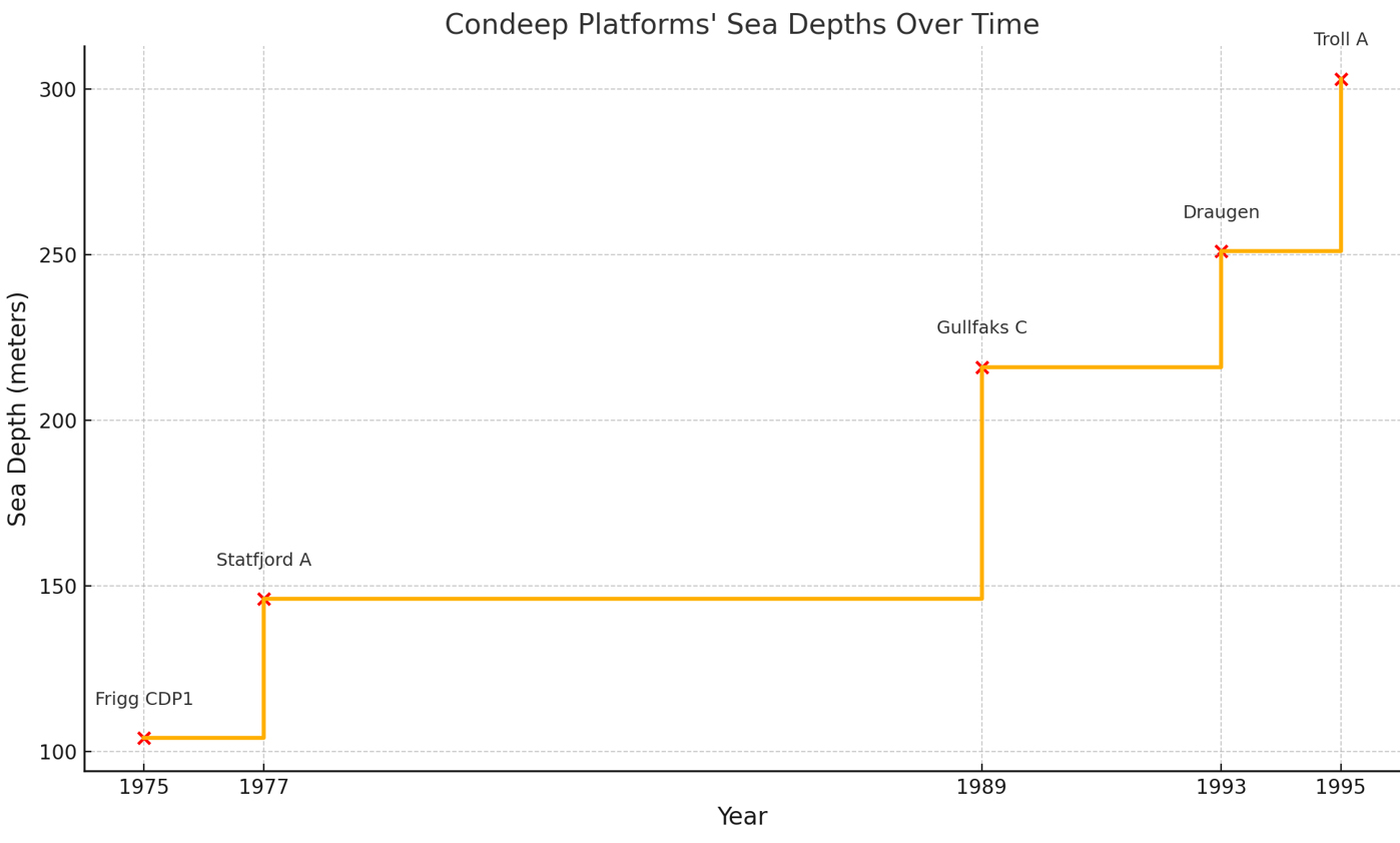 while Troll A, with 303 metres of water beneath it, surpassed its predecessor