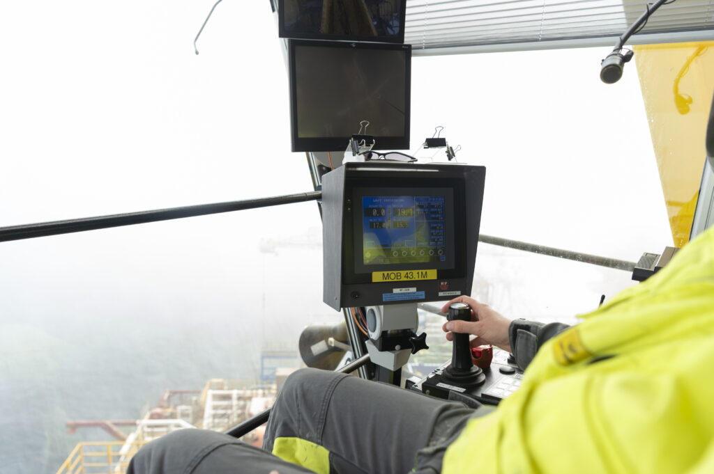 High up in the crane, the crane operator is tasked with lifting heavy containers up and down. From their position in the crane, people onboard the ships appear as tiny figures, and in thick fog, it can be impossible to see them at all. Under such conditions, goods cannot be moved.