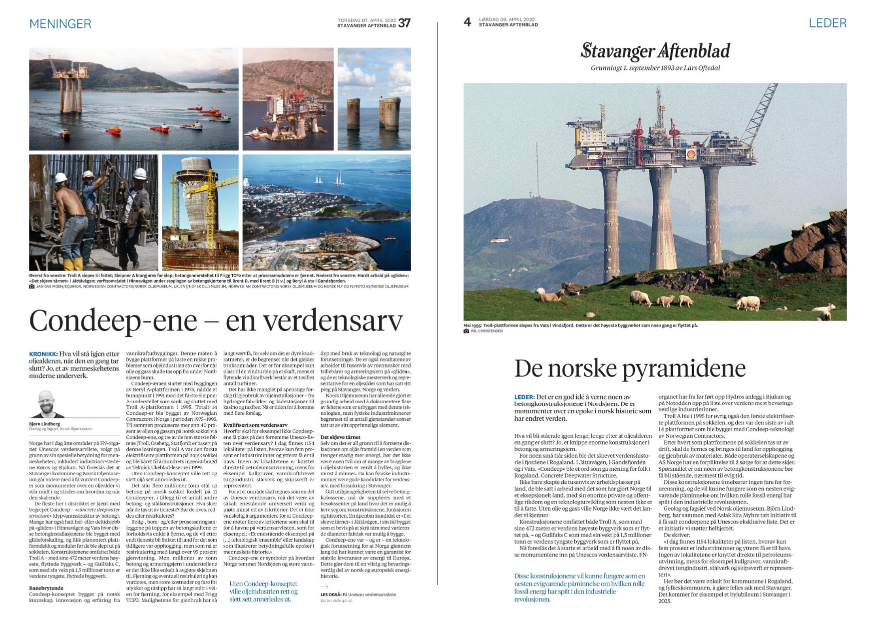 I april og mai 2022 kom flere oppslag i Stavanger Aftenblad, som omhandlet condeepenes posisjon og muligheten for en verdensarvstatus.[REMOVE]Fotnote: Se f.eks. Knutsen, Kjell Arne (2022, 7. april). Stavanger vil ha betongplattformer på verdensarvlisten. Stavanger Aftenblad, s. 40-41, og Lindberg, Björn (2022, 7. april). Condeep-ene – en verdensarv. Stavanger Aftenblad, s. 37. Se også NRK Rogaland: Espeland, A. J. og Kalstad L. M. (2022, 13. mai). Mener norske plattformer er like unike som Frihetsgudinnen og Den kinesiske mur. https://www.nrk.no/rogaland/mener-condeep-plattformene-i-nordsjoen-horer-hjemme-pa-unescos-verdensarvliste-1.15964684 Avisen støttet ideen på lederplass og omtalte condeepene som «de norske pyramidene».[REMOVE]Fotnote: De norske pyramidene (Leder, 2022, 9. april) Stavanger Aftenblad, s. 4.