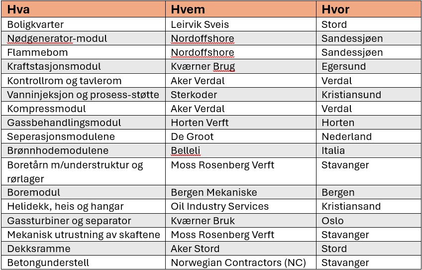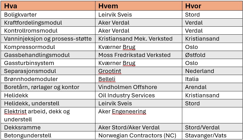 Andre leverandører var Kværner Bruk, som leverte gassturbinsystem og kompressormodulen, Kristiansand mekaniske verksted laget vanninjeksjons- og prosesstøttemodul, Vindholmen Offshore hadde ansvar for modulene for boretårn, rørlager og kontor, og Moss Fredrikstad Verksted konstruerte gassbehandlingsmodulen. Av utenlandske leverandører kan nevnes italienske Bellini, som stod for brønnhodemoduler, samt nederlandske Grootint, som stod for separasjonsmodulen.