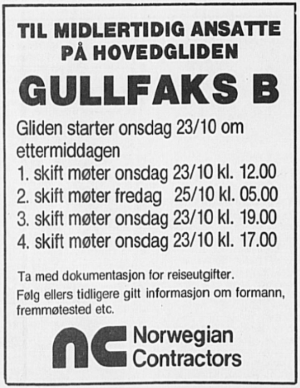 Det endte i konflikt mellom partene. 7. oktober 1985, samme dag som gliden på Gullfaks B skulle ha startet, fikk 200 fast ansatte permitteringsvarsel, mens 600 midlertidig ansatte fikk beskjed om oppsigelse.[REMOVE]Fotnote: Risholm. T. (08.10.1985) 200 permittert ved Norwegian Contractors. Stavanger Aftenblad s. 7 Grepet fra NC var noe paradoksalt, ettersom den grunnleggende årsaken til konflikten var nettopp mangel på arbeidskraft.
