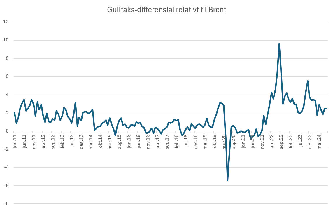 Når Gullfaks i desember 2024 hadde et differensial på 1,85 betyr det at den skattbare inntekten til Gullfaks-lisensen regnes ut med å ta utgangspunkt i normprisen for datert brent, fem dager etter lastedato (når oljen antas å nå kjøper), og deretter legges til 1,85 dollar per fat.[REMOVE]Fotnote: Energidepartementet. (2024, 9. desember). Petroleumsprisrådet og normpriser. Regjeringen. https://www.regjeringen.no/no/tema/energi/olje-og-gass/petroleumsprisradet–og-fastsetting-av-n/id661459/