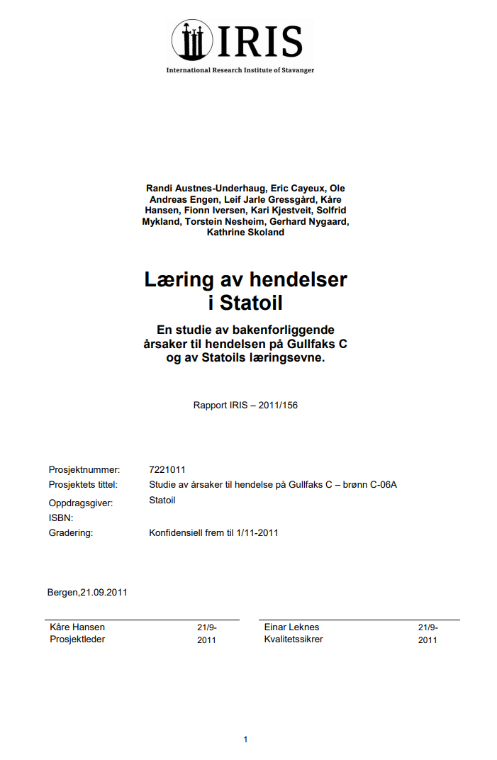 Petroleumstilsynet påla samtidig Statoil å gjennomføre en dyptgående studie av de bakenforliggende årsakene til hendelsen på Gullfaks C. Oppdraget ble gitt til forskningsinstituttet IRIS (International Research Institute of Stavanger), med et tydelig mandat om å undersøke Statoils evne til å lære av tidligere feil og hendelser. Formålet var å identifisere organisatoriske, kulturelle og strukturelle forhold som hadde bidratt til svekket risikostyring.[REMOVE]Fotnote: IRIS. Læring av hendelser i Statoil. En studie av bakenforliggende årsaker til hendelsen på Gullfaks C og av Statoils særingsevne. Rapport IRIS – 2011/156.