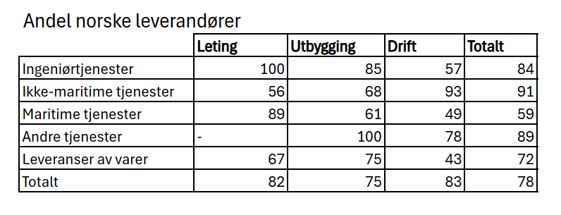 Særlig maritime tjenester stakk seg ut med både mer konkurranse i budrundene (2,9 bud per kontrakt i snitt) og lavest norsk-andel (59 prosent). Dette markedssegmentet var slik sett gjenstand for mer internasjonal konkurranse. En forklaring kan være at maritime tjenester var mer mobile, og dermed kunne brukes flere steder i verden.