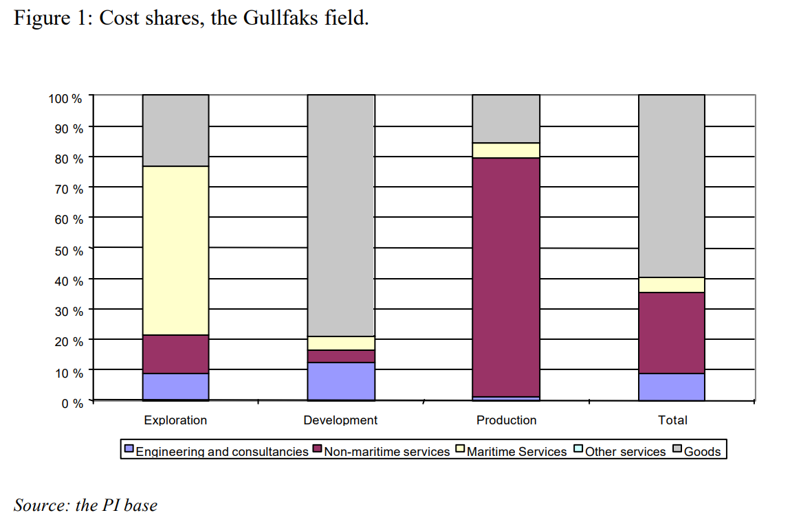 Systematiseringen av kontraktene på Gullfaks viser at maritime tjenester stod for de største utgiftene i letefasen, mens varer dominerte i utbyggingsfasen, og ikke-maritime tjenester var størst i driftsfasen.