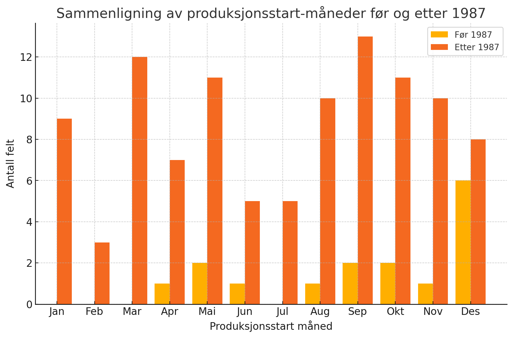 Figuren nedenfor viser oppstartsmåned for alle felt på norsk sokkel, i perioden før 1987 og perioden etter 1987. Den viser at det frem til og med 1987 var en klar (og statistisk signifikant) overrepresentasjon av «desember-barn», og at denne overrepresentasjonen ikke finnes blant felt som er satt i produksjon etter at avskrivningsreglene ble endret.[REMOVE]Fotnote: Overrepresentasjonen i desember er statistisk signifikant, med et konfidensintervall på 99 %.