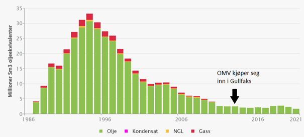 Gullfaks-produksjonen var i 2013 på snaue 16 millioner fat, noe som utgjorde 7,7 prosent av hva feltet hadde produsert i toppåret 1994. Gullfaks befant seg med det i haleproduksjonen. I den grad OMV satt på relevant kompetanse knyttet til senfase-produksjon og økt utvinning, kunne dette komme til nytte i Gullfaks-lisensen.[REMOVE]Fotnote: Øvrebek. H (29.10.13) «Går fra oljeboring i potetåkre til Arktis». Stavanger Aftenblad, s. 16.