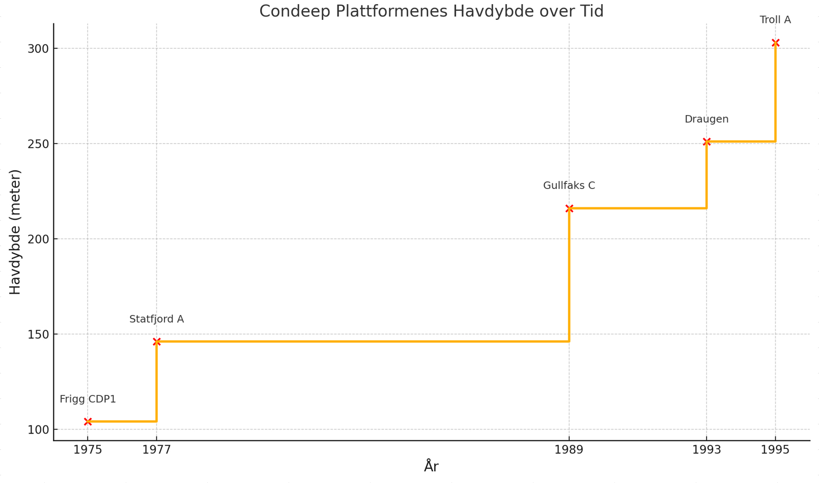 Figuren nedenfor viser hvilken condeep på norsk sokkel som til enhver tid har vært plassert på størst havdyp. Avstanden mellom Statfjord A og Gullfaks C representerer det største enkelthoppet, men rekorden holdt kun i fire år og ble slått av Draugen i 1993. Troll A er i dag den condeep-en som er plassert på det største dypet. Merk at condeep-er som er festet til havbunnen med strekkstag, som Troll B og Heidrun, ikke er inkludert.