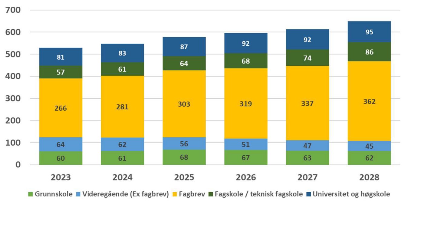 Forskingsinstituttet NORCE har gjort ei vurdering som viser at det i åra framover vil vere eit behov for å erstatte mange offshore-tilsette. Det største rekrutteringsbehovet ligg innanfor tilsette med fagbrev. Fram mot 2028 er det estimert at det årleg er eit behov for å erstatte mellom 250 og 300 personar med andre som har fagbrev.[REMOVE]Fotnote: Fjelldal, Øystein M. og Blomgren, Atle (begge NORCE). Offshoreansatte 2018-2023. Rapport nr. 23-2023, Helse og Samfunn, s. 50. https://norceresearch.brage.unit.no/norceresearch-xmlui/bitstream/handle/11250/3120611/NORCE%20H%26S%20rapport%20nr.%2023-2023.pdf?sequence=1&isAllowed=y Lasta ned 1. august 2024.
